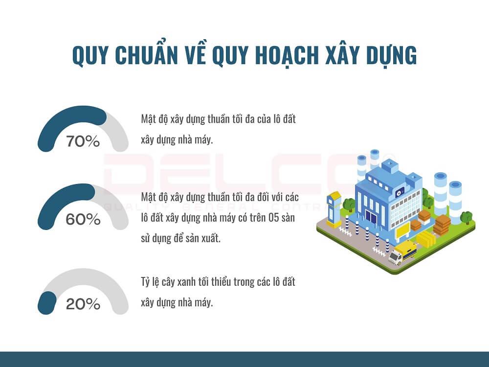 QCVN 01:2021 Quy chuẩn về Quy hoạch xây dựng nhà máy quy định mật độ xây dựng thuần của lô đất xây dựng nhà máy, tức là tỷ lệ diện tích chiếm đất của các công trình kiến trúc chính trên diện tích lô đất, tối đa là 70%. Đối với các lô đất xây dựng nhà máy có trên 05 sàn sử dụng để sản xuất, mật độ xây dựng thuần tối đa là 60%. Tỷ lệ cây xanh tối thiểu trong các lô đất xây dựng nhà máy phải đạt tối thiểu là 20%.