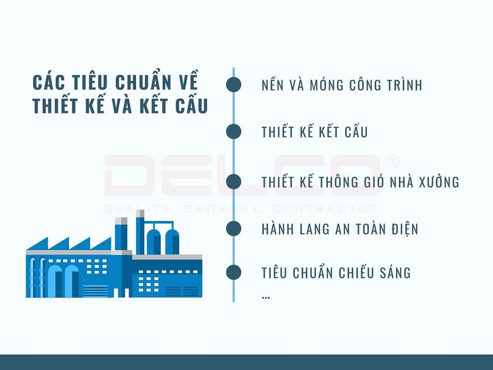 Các tiêu chuẩn thiết kế nhà xưởng được ban hành đã quy định rất rõ ràng và nghiêm ngặt từng hạng mục, về điều kiện địa chất công trình, biện pháp xử lý nền móng thích ứng, tiêu chuẩn thiết kế kết cấu bê tông cốt thép, kết cấu thép, các tiêu chuẩn về thiết kế thông gió, hành lang an toàn điện, tiêu chuẩn chiếu sáng…