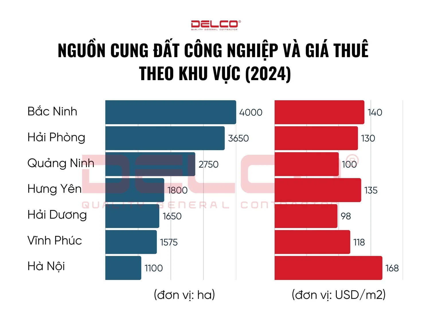 Trong năm 2024, nguồn cung đất công nghiệp tại miền Bắc tiếp tục tăng đáng kể, tỷ lệ lấp đầy tại các khu công nghiệp trọng điểm đạt trên 83%. Mặc dù vậy, giá thuê đất công nghiệp vẫn duy trì mức cạnh tranh, thấp hơn khoảng 22% so với miền Nam.