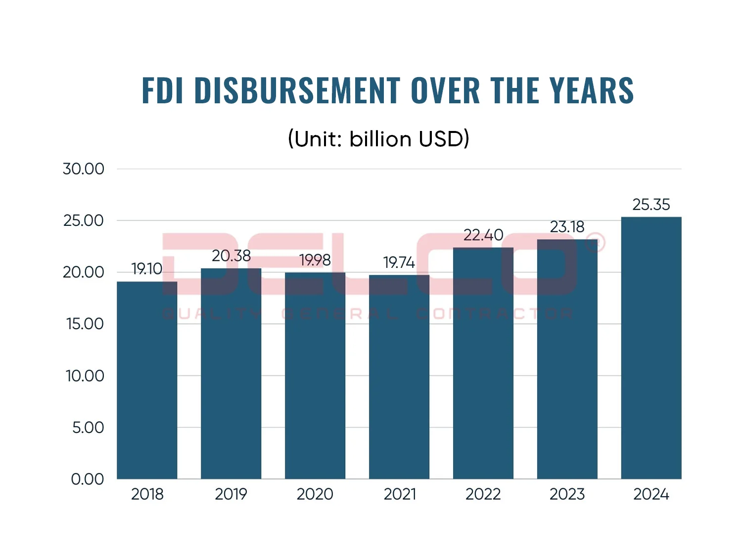 According to the General Statistics Office, Vietnam’s total FDI disbursement in 2024 reached $25.35 billion, a 9.4% increase compared to the previous year and the highest level ever recorded. This reflects strong confidence from foreign investors in Vietnam’s stable business environment.