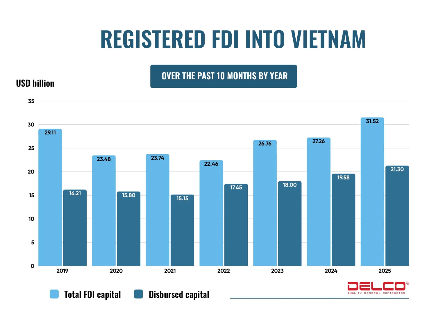 As of October 31, 2025, total registered FDI into Vietnam reached $31.52 billion, up 15.6% compared to the same period last year compared to the same period last year.