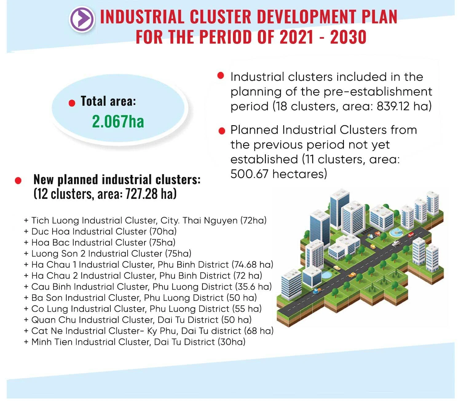 - New planning of 4 industrial parks with a total area of 1,599 ha located in Phu Binh district (03 zones with an area of 731 ha) and Pho Yen city (01 zone with an area of 868 hectares)