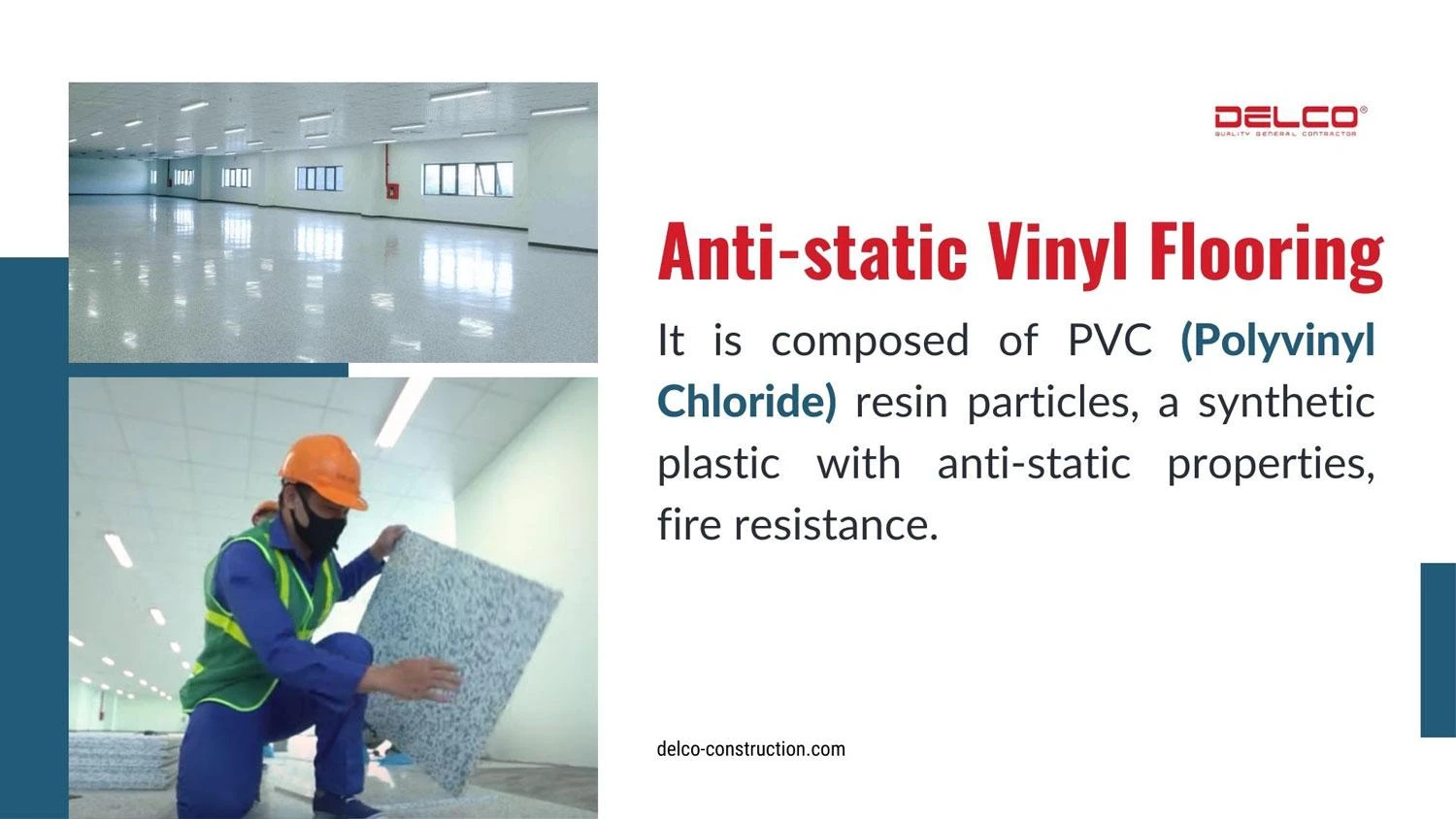 Anti-static vinyl flooring comes in the form of tiles (rectangular, square) or rolls, and is composed of polyvinyl chloride resin particles – a synthetic plastic with anti-static properties, fire resistance, and commonly used in cleanroom environments or in manufacturing and assembling electronic components factories,..