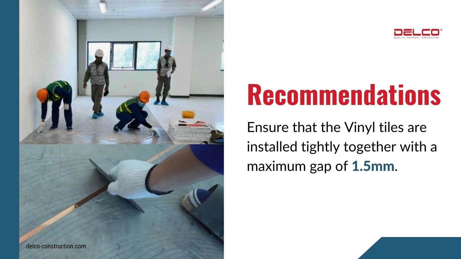 - Ensure that the Vinyl tiles are installed tightly together with a maximum gap of 1.5mm.