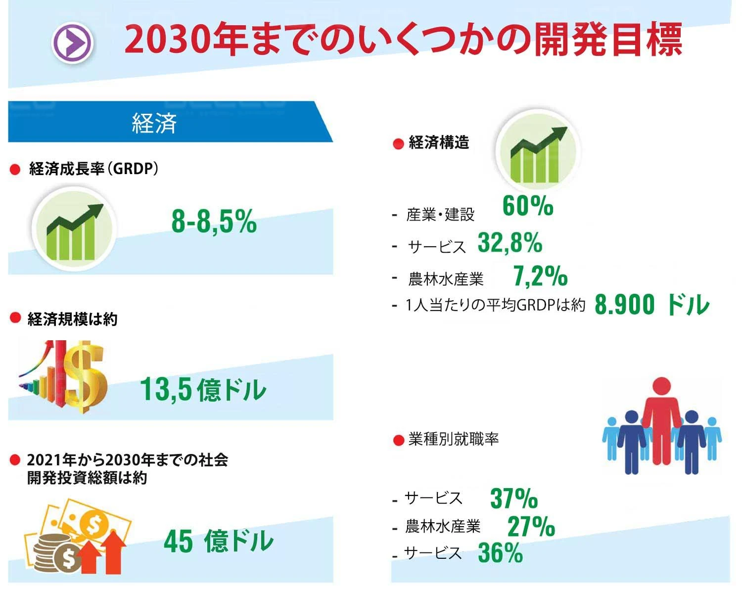 - 経済成長率(GDP)が年率8%〜8.5%程度に達し、 経済規模は約135億ドルに達した。 2021年から2030年までの社会開発投資総額は約450億ドルに達するように努めます。