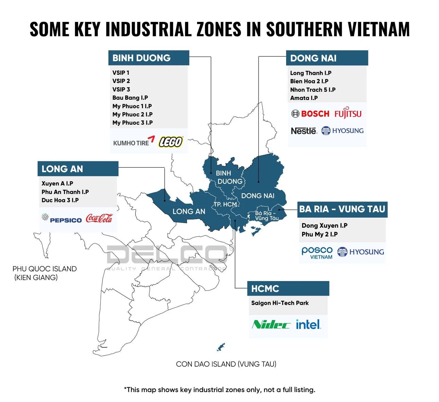 ベトナム南部特にホーチミン市、ビンズオン、ドンナイ、ロンアンなどは、ベトナムで最も工業団地が集中しているところである。ベトナム南部にはガス資源とともに豊富な農産物(コーヒー、コショウ、カシューナッツ、食品など)があるため、エネルギー、重工業、裾野産業、食品加工の工場に適している。更に、この地域には深海港システム及び国際空港が有るため、輸送に便利である。