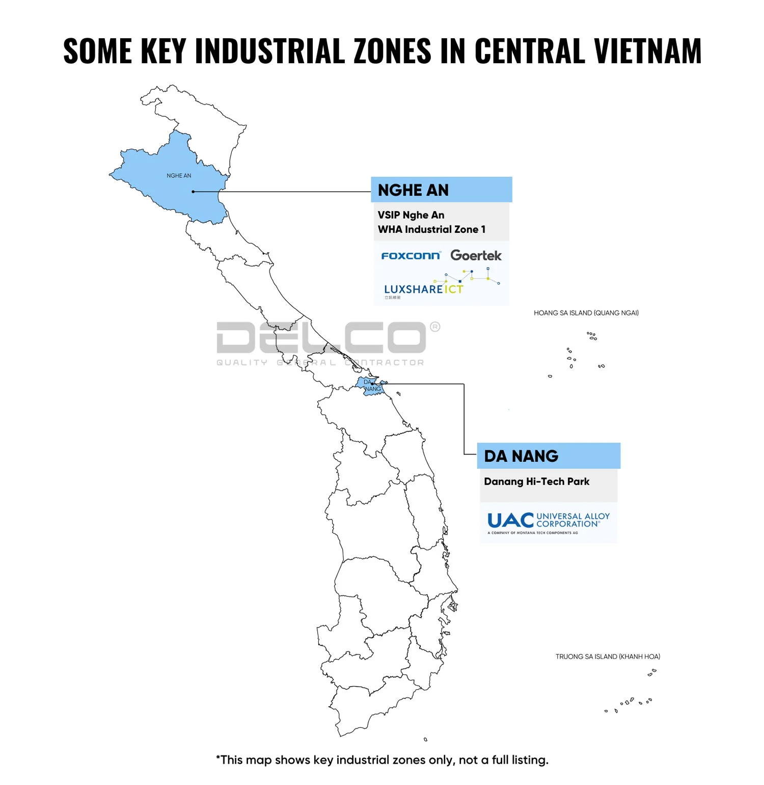 DELCOは、ニットクファクトリー、ベトナムのヴィンフック省GSファクトリー、Power Plus Technologyファクトリー、Vietnam Rare Earthファクトリーなど、ベトナム北部で多くの大きなプロジェクトを実施してきた。