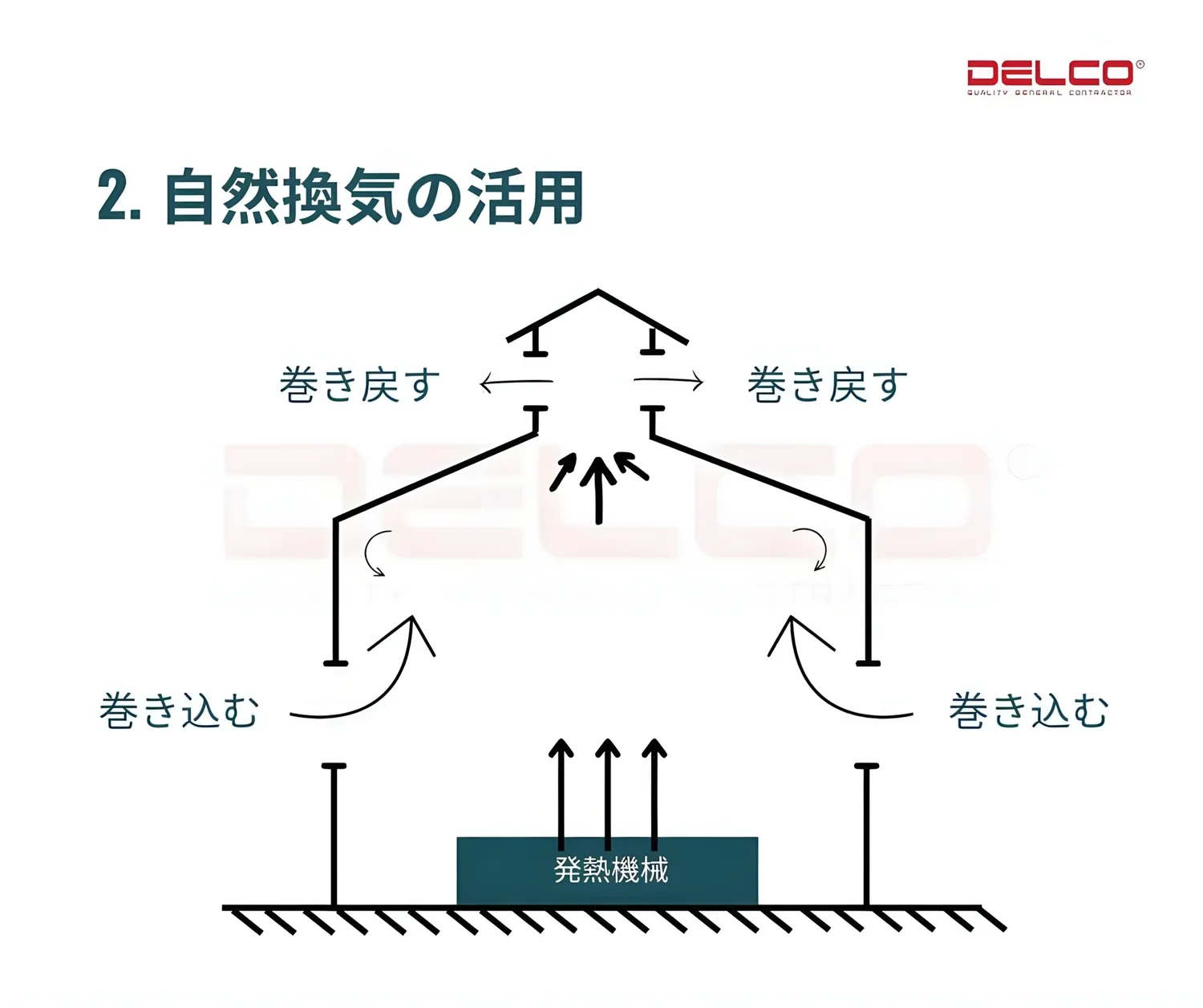 壁、天窓、屋根のドアに組み合わせたシャッター(ルーバー)の配置…合理的な方法で、科学は対流空気の流れに能力を高め、ワークショップに冷気を描き、熱気を押し出すことになります。空気の出入りの対流によって常に空気が更新されるため、工場内に自然な換気が行われることになります。自然換気の活用は、健康的な生産環境を確保するだけでなく、工場の省エネルギー化などさまざまなコスト削減にもつながります。