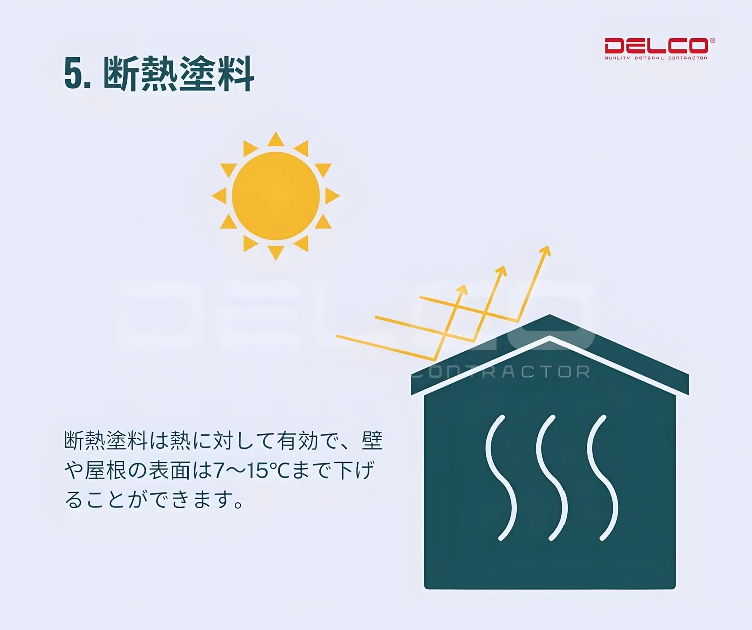 断熱塗料は、耐熱塗料、耐熱塗料とも呼ばれ、外壁、ガラスの断熱材、波板、瓦屋根、陸屋根などによく使われます。塗料は熱に対して有効で、壁や屋根の表面は7~15℃まで下がります。また、耐熱塗料の中には、防水性が高く、剥がれたり割れたりしないもの、UVカットや熱線を最大80%サポートするものなどがあります。