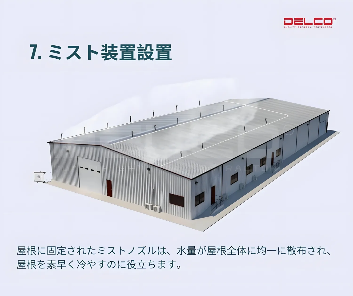 屋根に固定されたスプリンクラーは、屋根全体に均等に散水されるため、その量によって屋根が非常に早く冷やされます。この方式は、投資コストや運用コストが低く、環境にやさしいのが特徴です。