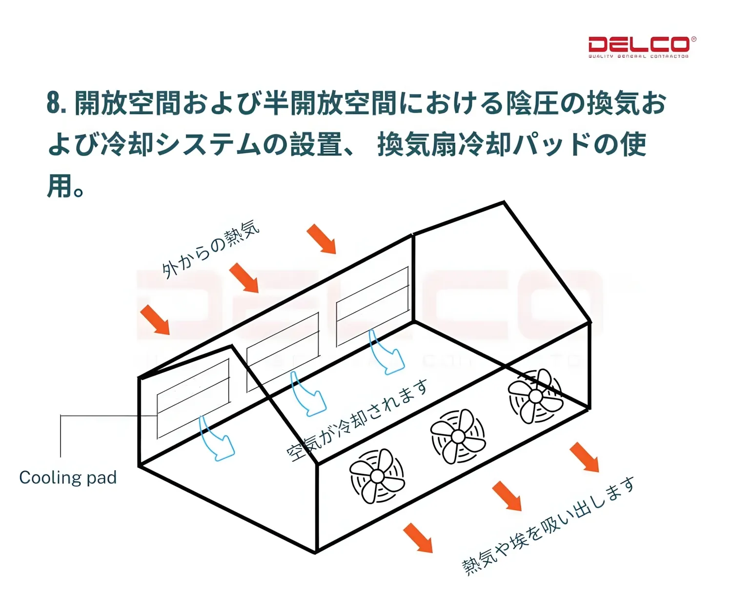 開放空間および半開放空間における陰圧の換気および冷却システムの設置、 換気扇冷却パッドの使用。