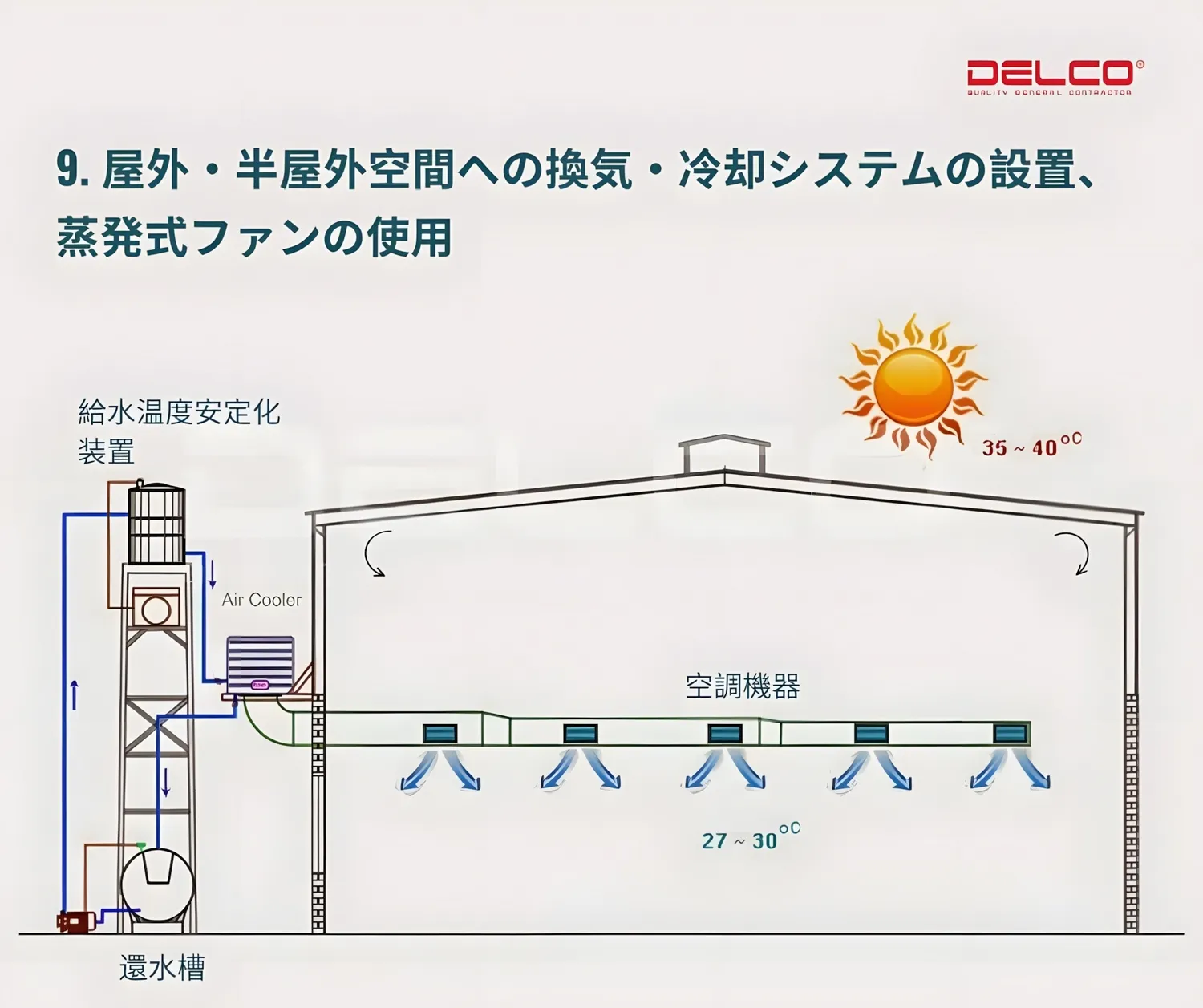 開放空間および半開放空間における換気・冷却システムの設置、換気扇冷却パッドの使用