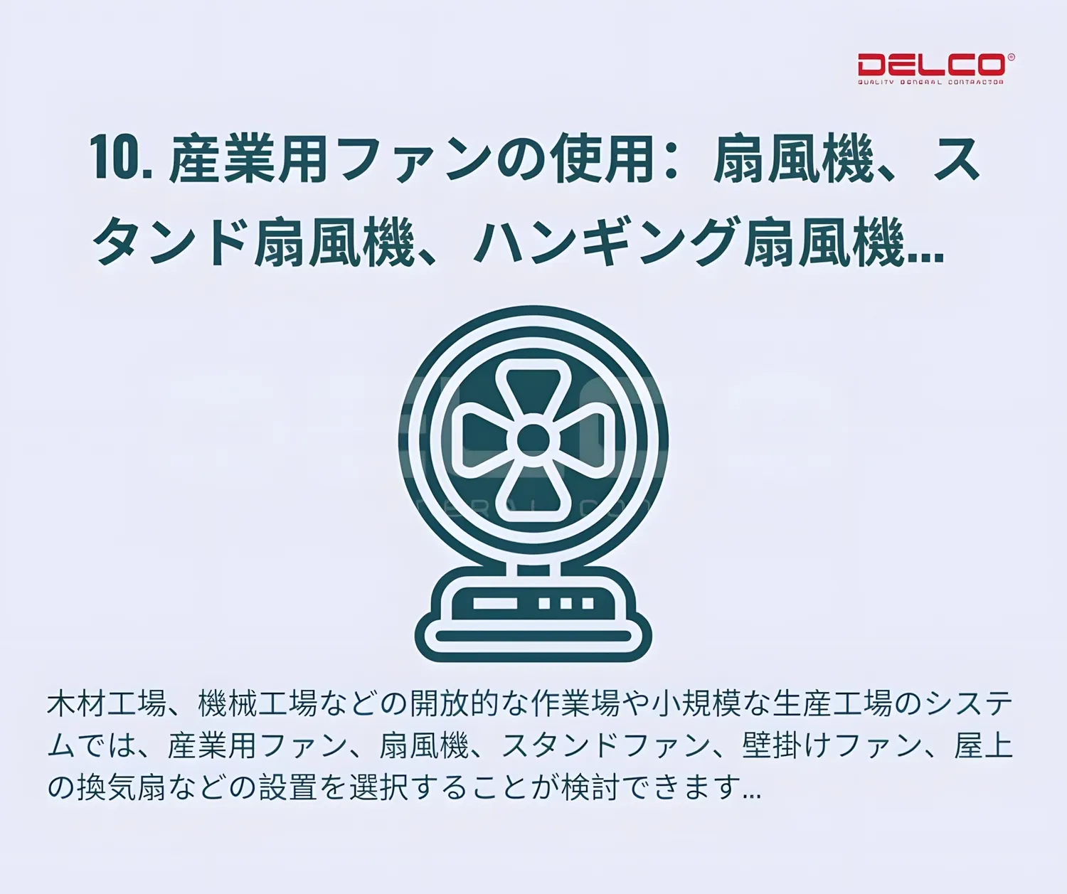 木材工場、機械工場などの開放的な作業場や小規模な生産工場のシステムでは、産業用扇風機、扇風機、壁掛け扇風機、屋上の換気扇などの設置を選択することが考えられます…。