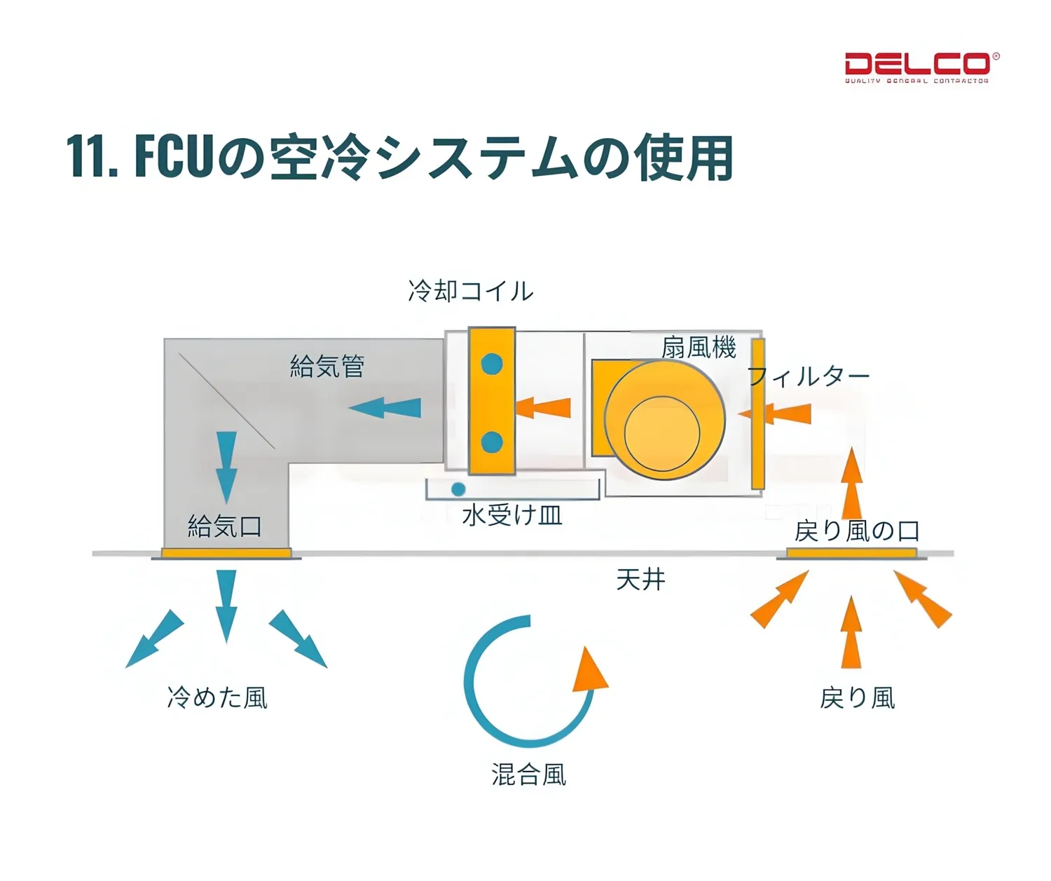 工場システムであまり大きなスペースがない場合は、FCU(ファンコイルユニット)を使った解決策をとることができます。FCUは、空調室からの空気を戻り空気取入口から、ファンで押されてFCUのコールドコイルを通り、空気を冷却して水分を分離し、供給空気ダクトと空気出口グラントから再び空調室に供給されることになります。