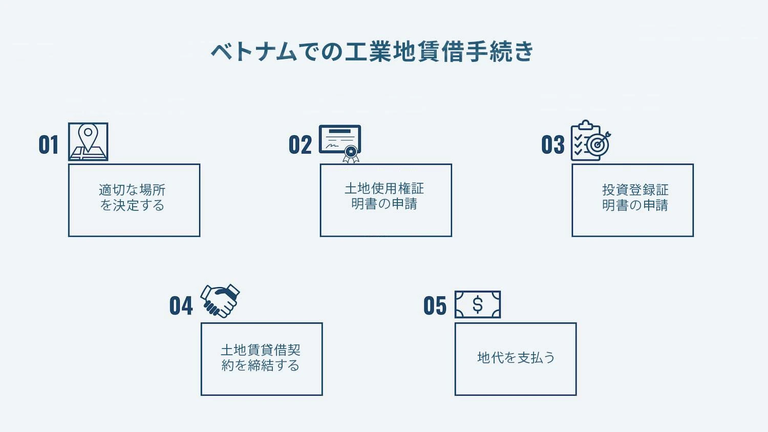 2013年土地法第126条の第3項によると、外資系企業がベトナムで投資プロジェクトを実施するためにベトナムの工業地を賃借する場合に定められた期間は、投資プロジェクトまたは土地賃借申請書に基づいて検討され決定されるが、50年を超えてはならない。