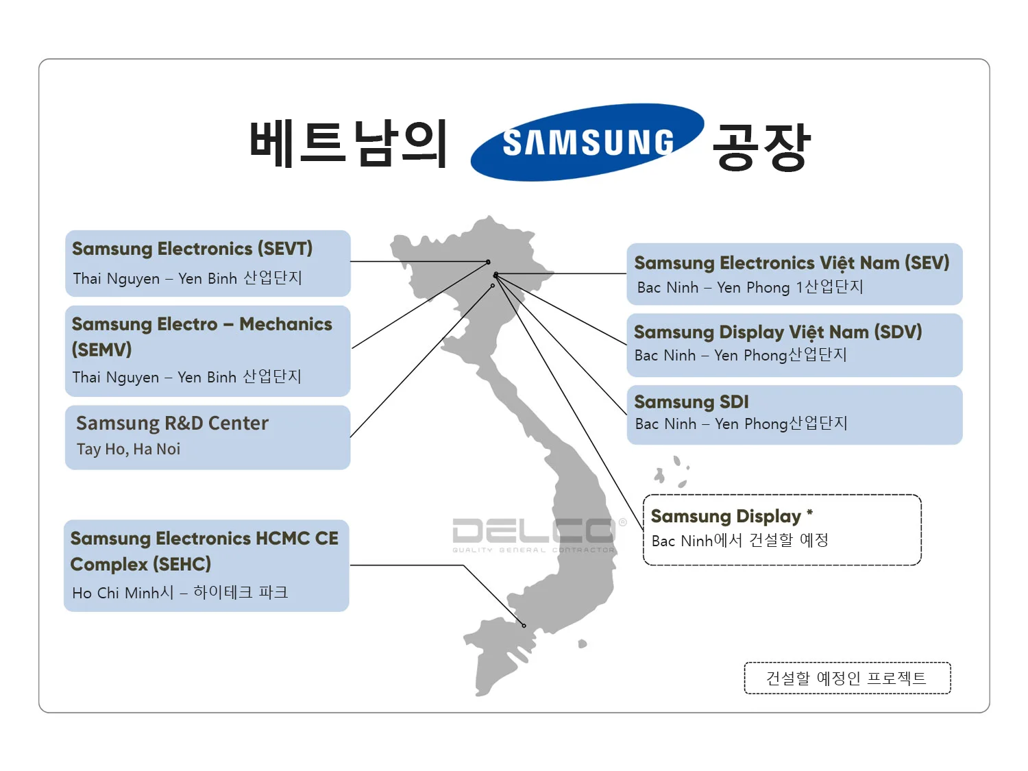 삼성은 현재 베트남에 가장 큰 FDI 투자자이며, 2022년 말까지 총 누적 투자 자본이 200억 달러였습니다. 삼성은 2008년 Bac Ninh의 휴대전화 공장으로 시작하고 6개의 공장과 R&D 센터로 사업을 확장했습니다. 2024년 삼성의 베트남 공장 4개에서 발생하는 매출은 625억 달러에 달했습니다. 2024년 5월 삼성은 총리와의 면담에서 앞으로 매년 10억 달러를 추가로 투자할 계획을 발표했습니다. 삼성은 직접적으로 투자할 뿐만 아니라 베트남에 공장을 투자하고 건설한 많은 삼성 1차, 2차 공급업체를 포함한 생태계를 가져왔습니다.