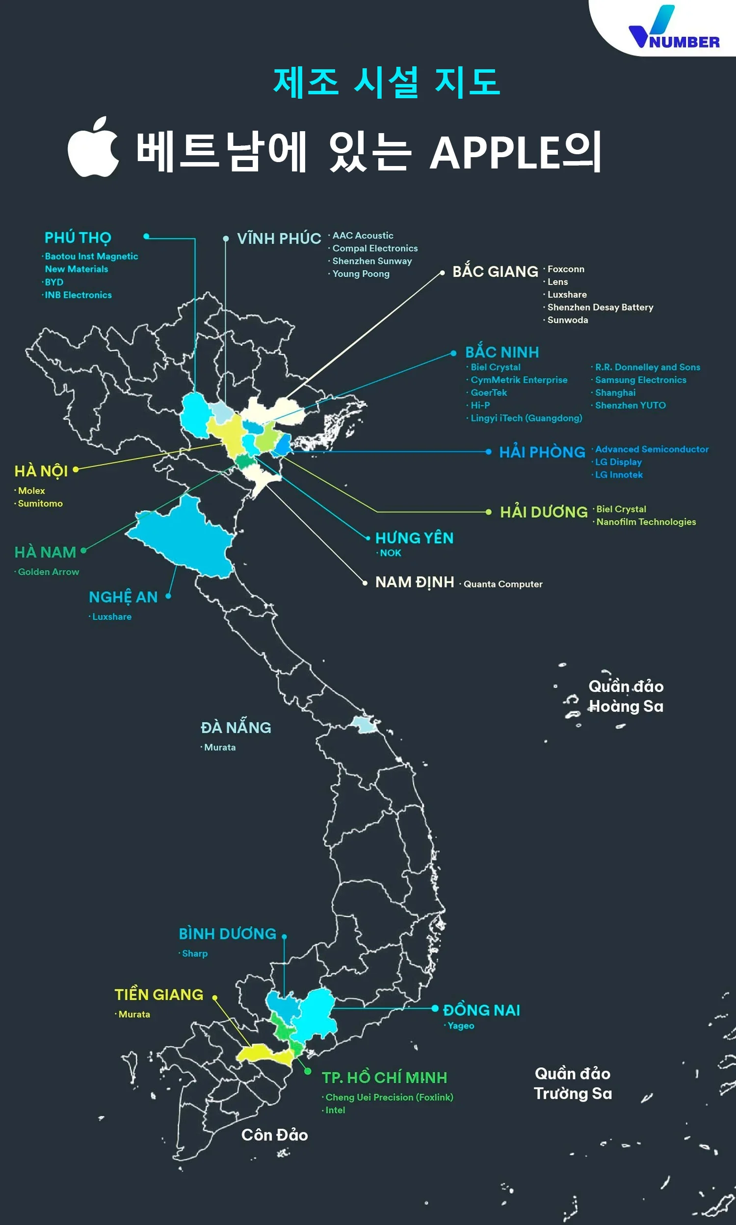 2019년부터 현재까지 Apple의 베트남 공급망을 통한 총 투자 자본은 약 160억 달러입니다. Luxshare, Foxconn 등 주요 파트너사는 수억 달러를 투자해 Nghe An성과 Bac Giang성에 공장을 건설했으며 이런 공장은 Apple의 글로벌 공급망에서 중요한 역할을 합니다.