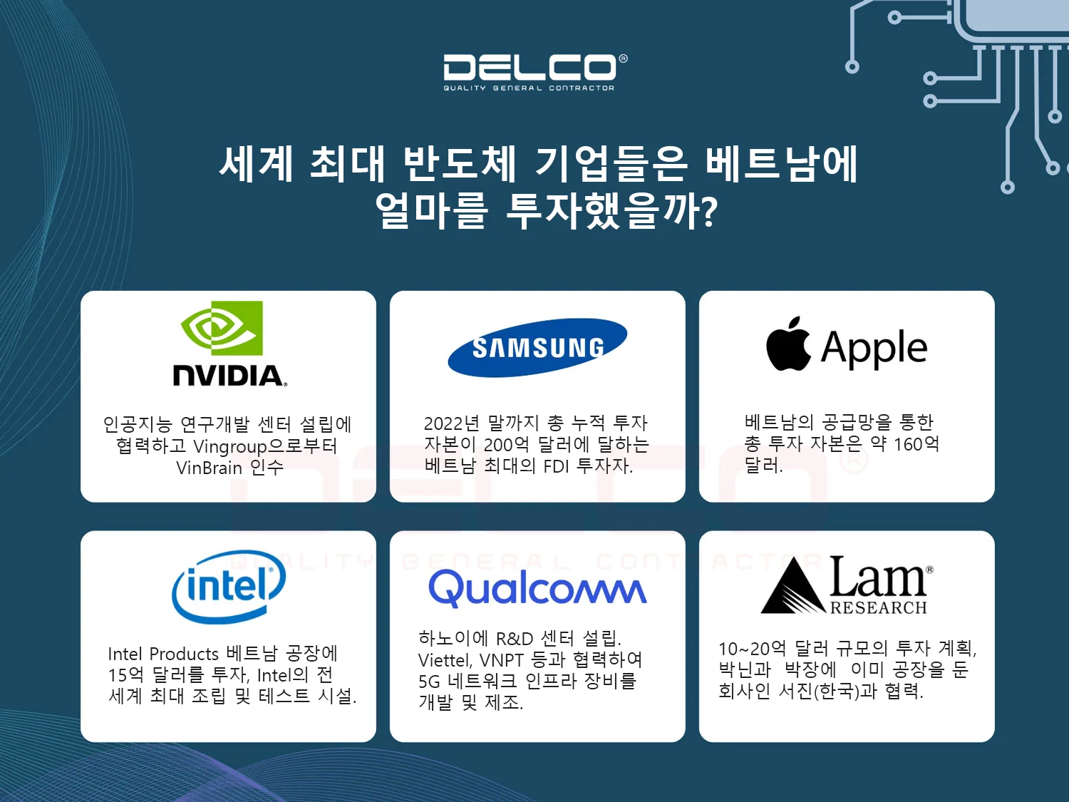 반도체 FDI 프로젝트 174개가 있고 총 투자 자본금 110억 달러 이상을 유치한 베트남은 세계 유수의 반도체 기업의 관심을 끌고 있습니다. Samsung, Intel, NVIDIA, Qualcomm 등은 베트남에 얼마나 투자했고 어떤 계획을 세웠습니까?