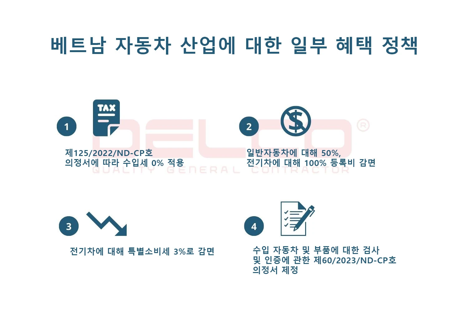베트남은 베트남 자동차 산업 현황에 직면하여 체결된 협정에 따른 면세 감세 정책 외에 태국 및 인도네시아에서 제조된 수입 완성차에 대해 수입세 0% 적용, 제 125/2022/ND-CP호 의정에 따라 한국에서 수입되는 자동차 부품에 대한 세금 면제, 등록비 50% 감면, 납세기한 연장 등 자동차 산업에 대한 유리한 정책과 매력적인 혜택을 제정했습니다.