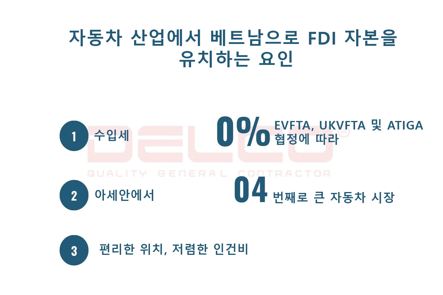 특히, 베트남은 Quang Ninh에 건설되고 있는 TC 그룹의 100% 투자자본 보유 Skoda 공장, 투자 자본금 7조 VND의 Thai Binh에 있는 Geleximco 공장, 투자금 3조2천억동의 Ninh Binh에 있는 현대 Thanh Cong Viet Nam 공장 등 여러 자동차 제조 및 조립 공장이 연속 건설함에 따라 계속해서 FDI 투자자들에게 잠재적인 새로운 시장이 됩니다.
