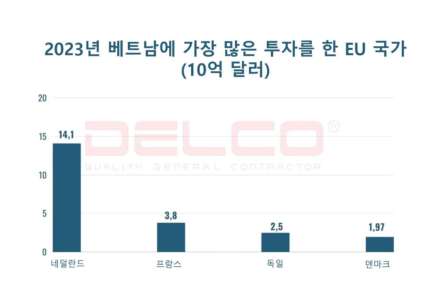 2023년 네덜란드는 427개 프로젝트를 수행하고 총 투자 자본이 141억 달러에 달하여 베트남에 대한 유럽 투자 자본의 49%를 차지함으로 1위를 차지했습니다. 이어 프랑스가 총 투자 자본 38억 달러로 13%를 차지하며 2위를 차지하고, 독일이 총 자본 25억 달러로 456개 프로젝트를 수행하여 9%를 차지하고, 덴마크가 163개 프로젝트를 수행하고 등록 자본이 19억 7천만 달러로 7%를 차지했습니다.