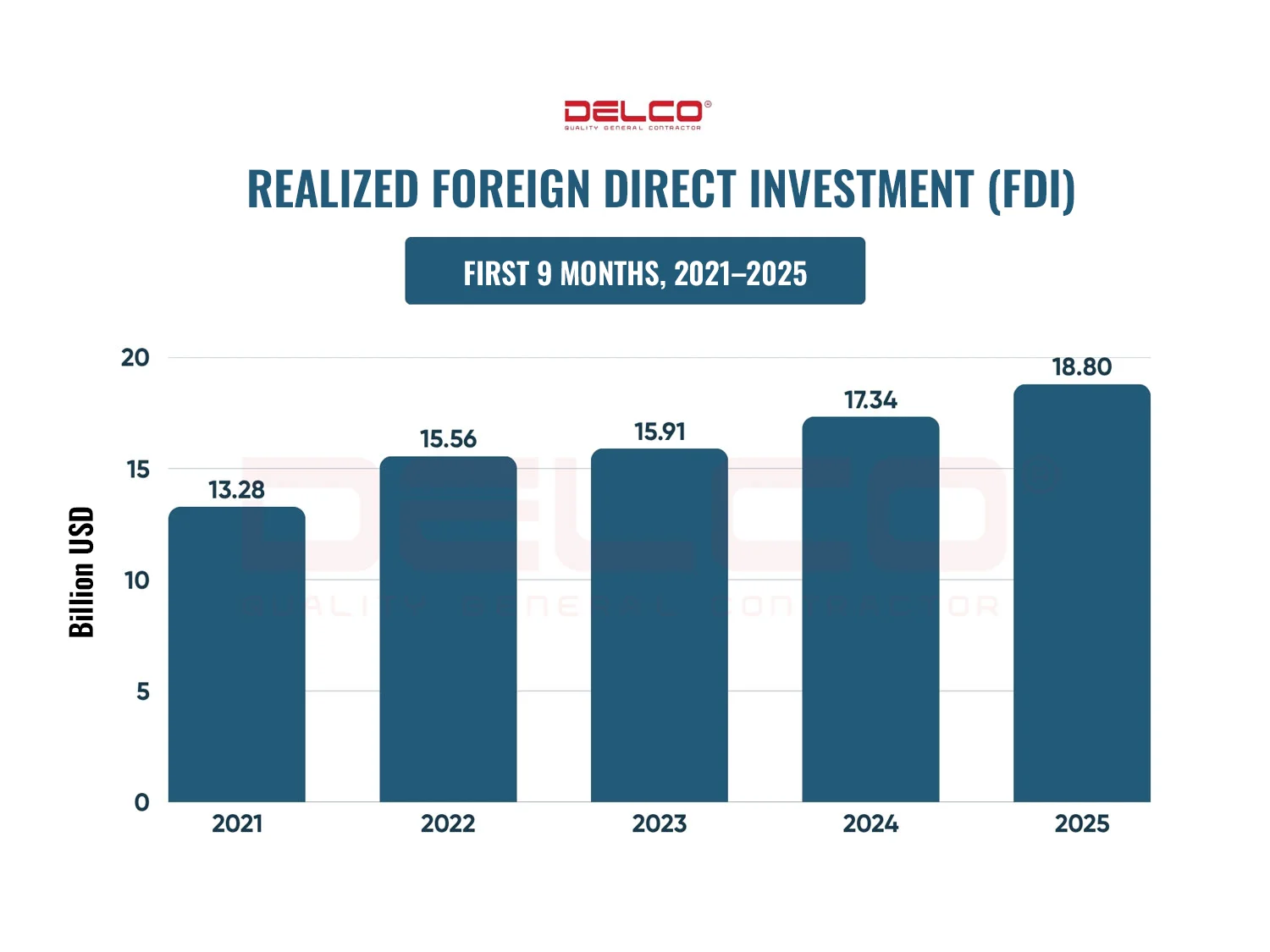 또한, 총 외국인직접투자(FDI) 자본은 약 188억 달러로 추정되며, 이는 전년 동기 대비 8.5% 증가한 수치로 최근 5년간 9개월 기준으로 가장 높은 수치입니다. 9개월간의 긍정적인 결과는 글로벌 경제가 여전히 많은 변동성을 안고 있는 가운데에서도 베트남 경제가 안정적인 성장세를 유지하고 있음을 보여주며, 외국인 투자자에게 긍정적인 신호로 받아들여집니다.