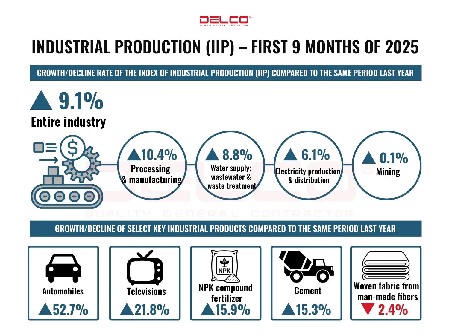 산업 생산은 계속해서 긍정적으로 회복되었으며, 2025년 9개월간 전 산업 생산지수(IIP)는 전년 동기 대비 약 9.1% 증가한 것으로 추정됩니다. 이 중에서도 가공 – 제조업 부문은 주도적인 역할을 계속 유지하며 10% 이상의 증가를 기록했으며, 특히 전자와 기계 관련 품목에서 두드러졌습니다.