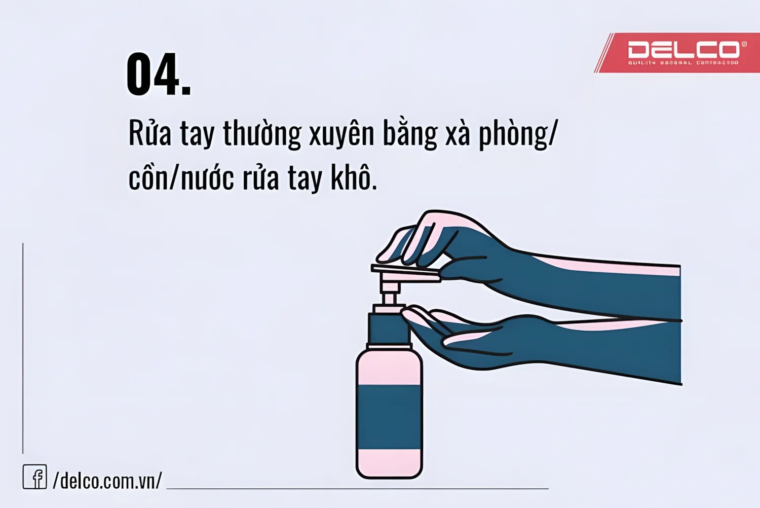 Thực hành vệ sinh tay đúng cách là một biện pháp kiểm soát lây nhiễm quan trọng. Tại các công trường DELCO, xà phòng sát khuẩn là thứ không thể thiếu ở bồn rửa tay. Thời điểm cần rửa tay hằng ngày là trước và sau ca làm việc, sau khi dùng toi-lét, sau khi chạm vào các máy móc dùng chung, trước khi đeo hoặc tháo bảo hộ mắt hoặc mặt (kính bảo hộ, kính an toàn, v.v.),…