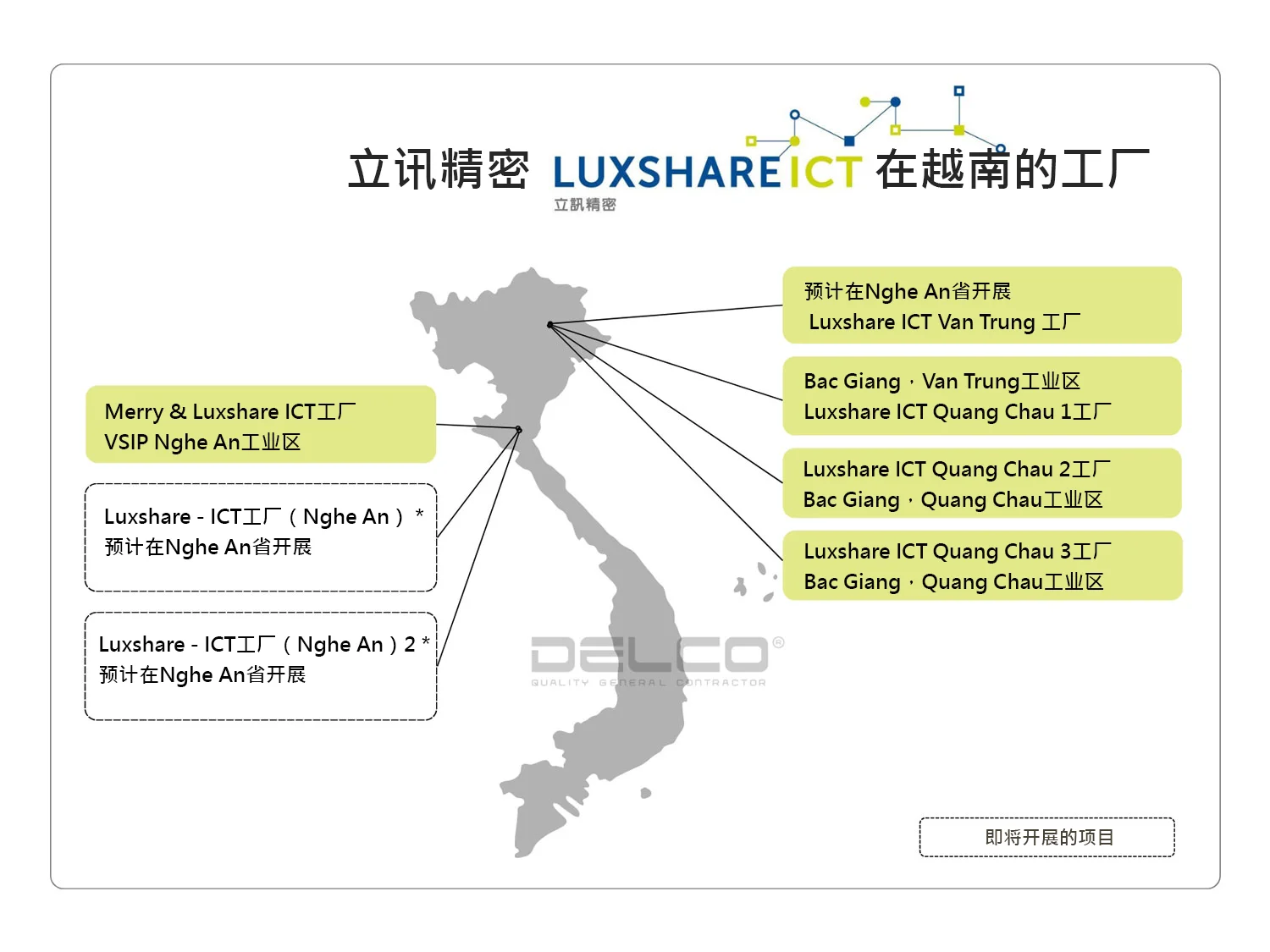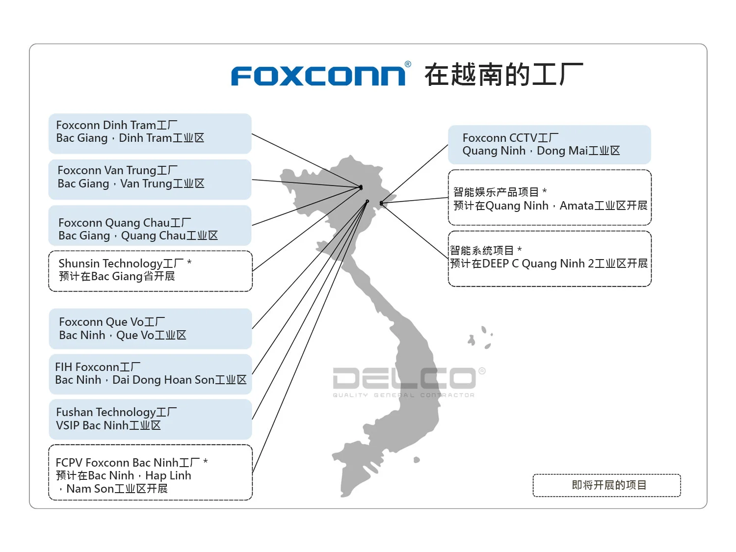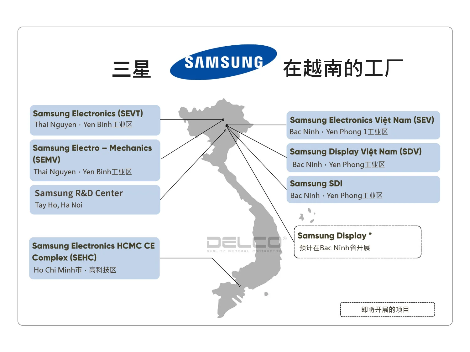HAEM VINA工厂是三星(Samsung)在越南的一级vendor。DELCO多次与HAEM合作,担任设计-施工总承包商角色,负责在越南建设工厂及厂房装修项目。