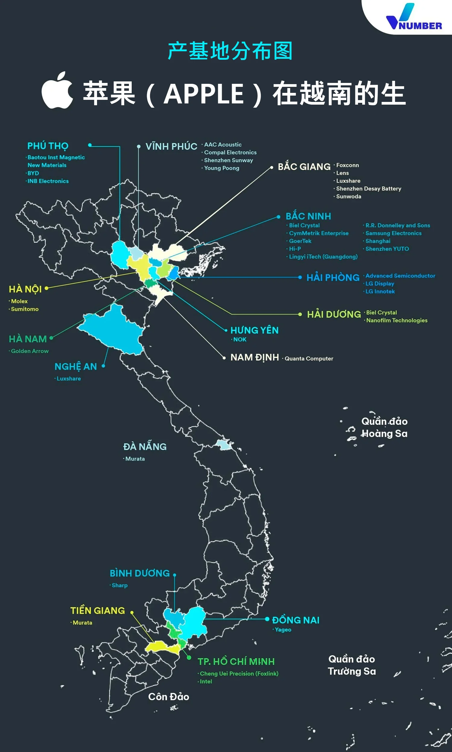 自2019年以来,苹果(Apple)在越南的供应链投资总额已达约160亿美元。其主要合作伙伴如立讯精密(Luxshare)和富士康(Foxconn)已投资数亿美元在Bac Giang建设工厂和在Nghe An建设工厂,在苹果(Apple)的全球供应链中发挥着重要作用。