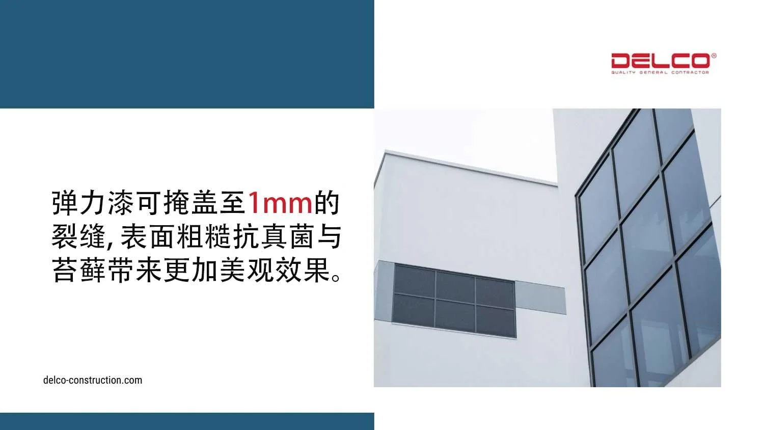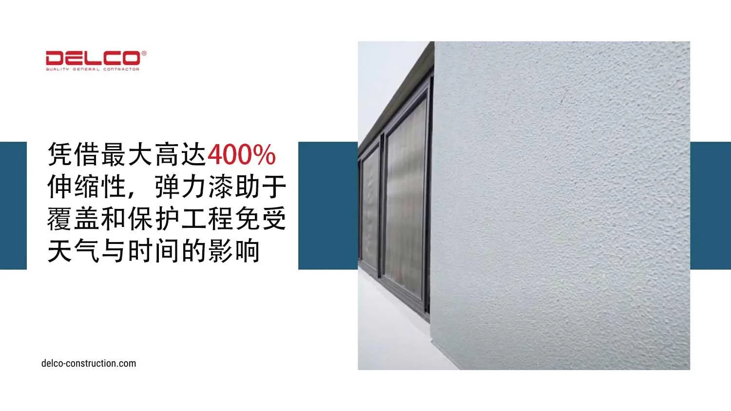 除了覆盖能力强, 弹力漆还有其他优点有助于保护工程免受天气的影响, 满足建造工程的美观性与牢固性。