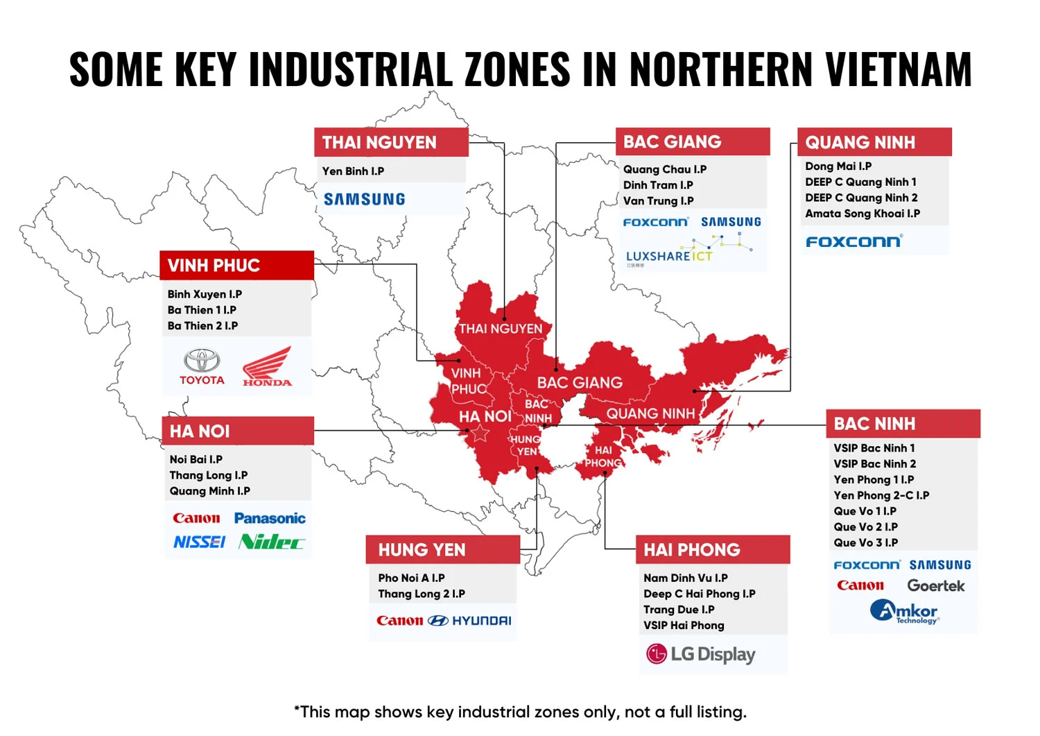 越南目前吸引着非常强劲的外国直接投资,工业区分布在全国各地。 下面是越南北部和南部最大的工业园区地图。