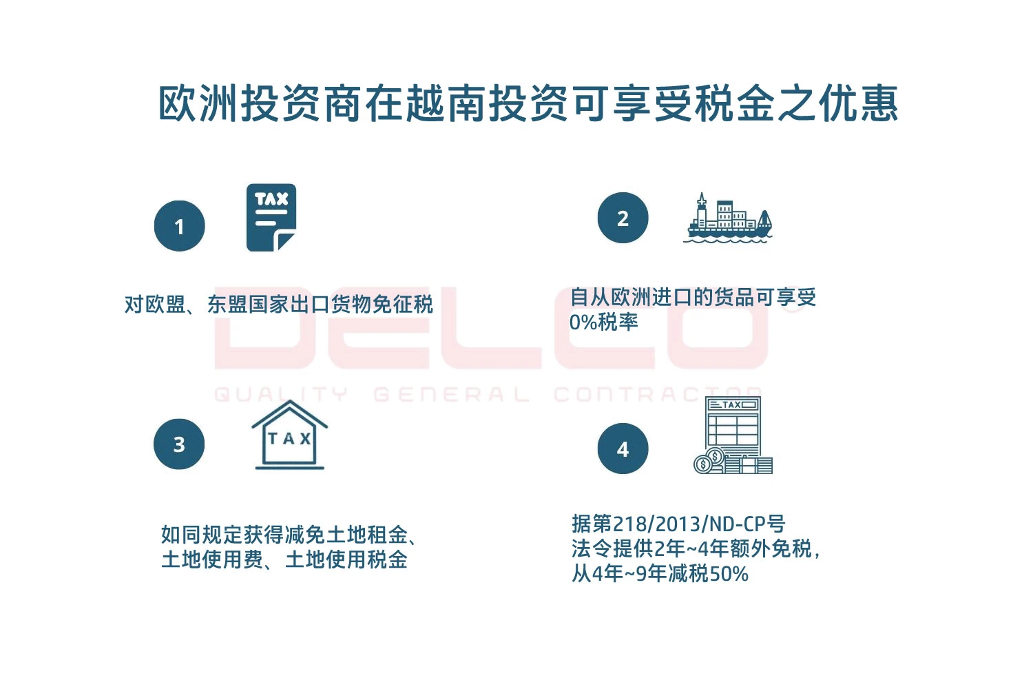 除了EVFTA的优惠外,欧洲FDI企业对越南投资还可以享受由越南政府颁行的优惠政策如:据第218/2013/ND-CP号法令提供2年~4年额外免税,从4年~9年减税50%等税收优惠政策,据ATIGA协定其享受对东盟国家货物进出口减免征税,据第135/2016/NĐ-CP议定的规定减免土地使用租金。